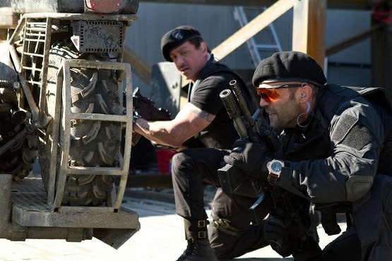 Sylvester Stallone goes brutal with Jason Statham in a new clip for "The Expendables 2". While embarking on a massive gunfight against a gang of mercenaries, Sly does a dangerous action by blowing up a hovering helicopter with a "flying" motorcycle. Also featured in the snippet is Terry Crews who knocks over a water tank with a grenade.