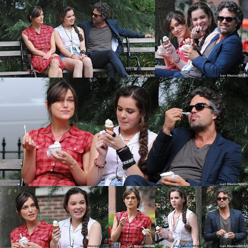 Sharing laughters on the set, Knightley and Ruffalo sat on a bench and enjoyed some ice cream. The former looked pretty in a red plaid dress, while the latter donned a dark blue suit atop his gray casual shirt. Steinfeld, meanwhile, joined them while baring her toned midriff in a tied white shirt and blue hotpants.