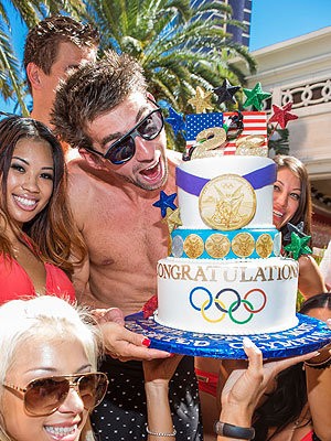 Phelps hosted the party on Saturday afternoon, September 1 at the Encore Beach Club. He's joined by a group of fans and friends including Allison Schmitt, Nathan Adrian and Charles Houchin. The athlete, who won 22 Olympian medals, was given an Olympic champ-themed cake by some bikini babes.